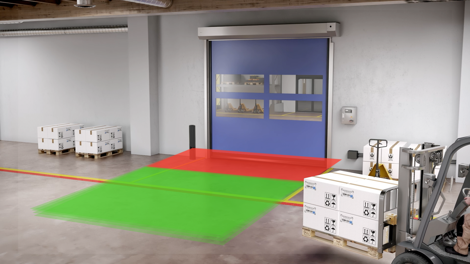 En estos entornos, la robustez y precisión del sensor es clave para operar con montacargas, camiones y personal.