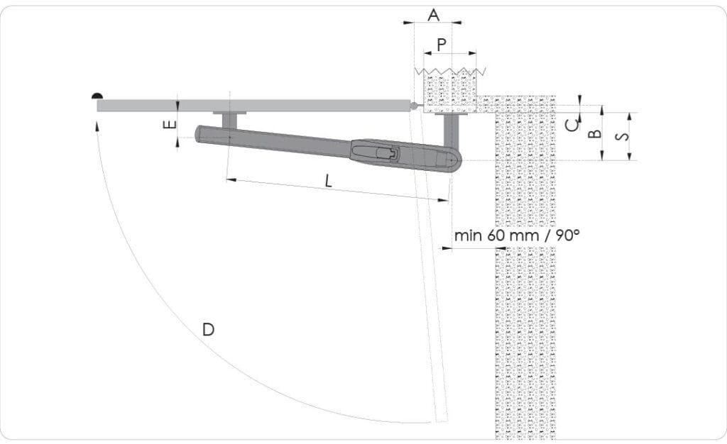El punto de fijación del automatismo varía según los espacios disponibles y la cancela que deba automatizarse; por tanto, corresponde al instalador elegir en cada caso la solución más adecuada para garantizar el funcionamiento correcto del sistema.