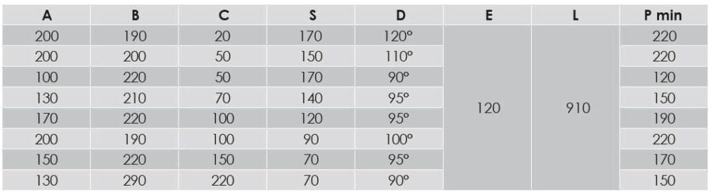 Las medidas de instalación indicadas en la tabla permiten elegir los valores de [A] y [B] basándose en el ángulo de apertura deseado y en referencia a los espacios y a las dimensiones presentes en el lugar. Aumentando la medida [A], se reduce la velocidad de acercamiento en apertura. Reduciendo la medida [B], se aumentan los grados de apertura de la cancela. Las medidas [A] y [B] deben ser de todas formas compatibles con la carrera útil del motor.
